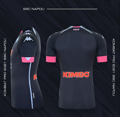 Le troisième maillot SSC Napoli 2021 a une couleur bleu très foncé, presque noire, tandis que le col V et les poignets sont roses, tandis que les logos de Kappa apparaissent en bleu ciel.
